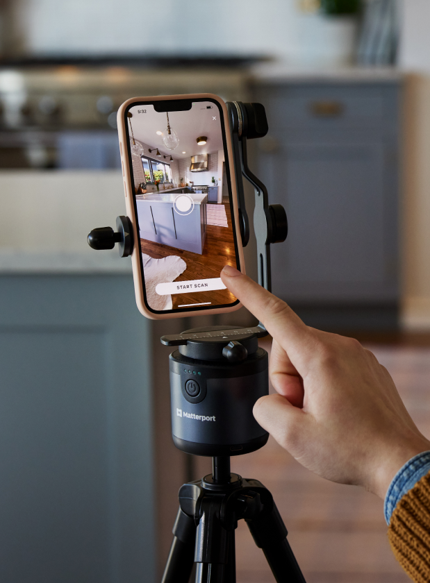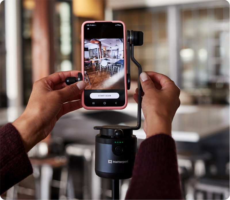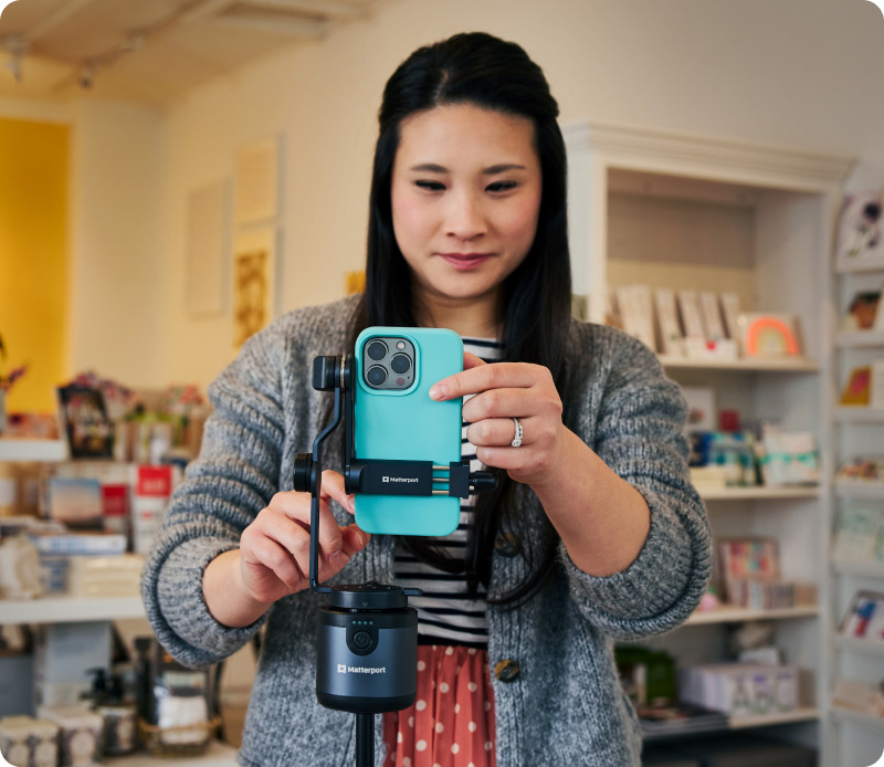 Axis emparelha com o aplicativo Matterport Capture para dispositivos iOS e Android. E seu braço ajustável garante alinhamento preciso para praticamente qualquer smartphone.